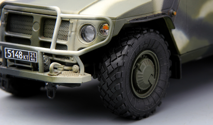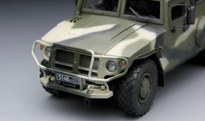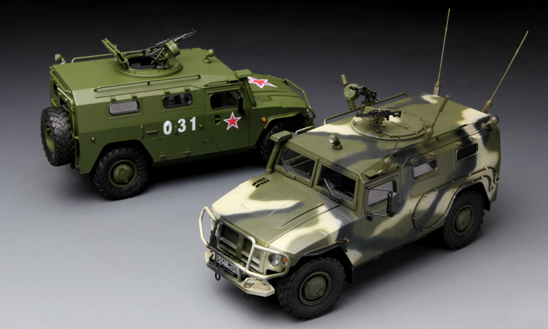 This 1/35 scale plastic model kit of 'Tiger' is a faithful replica of the Russian armored high-mobility vehicle. Not only is the unique outline accurately reproduced, but also cabin interior details are provided. All cabin doors can be built in open or closed position. Rotatable roof ring mount and decals for camouflaged interior covers all represent the real vehicle realistically. Two painting schemes are provided.