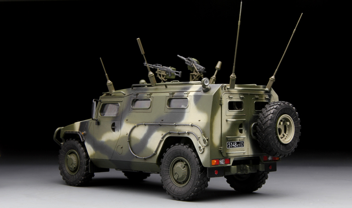 GAZ-233014 is the military variant of GAZ-2330 'Tiger' high-mobility vehicles which resemble the U.S. "Humvee" and are therefore called the 'Russian Humvee'. Entered military service in 2007, the 'Tiger' is capable of achieving an off-road speed up to 120-140km/h thanks to its high mobility design. A crew of six includes driver and co-driver plus 4 Special Forces personnel. Armament consists of roof ring mounted AGS-17 30mm automatic grenade launcher and 'Pecheneg' 7.62mm MG which can be simultaneously operated by two crew members through the open hatch. The cabin can also host a large storage of ammunition and RPG launchers.