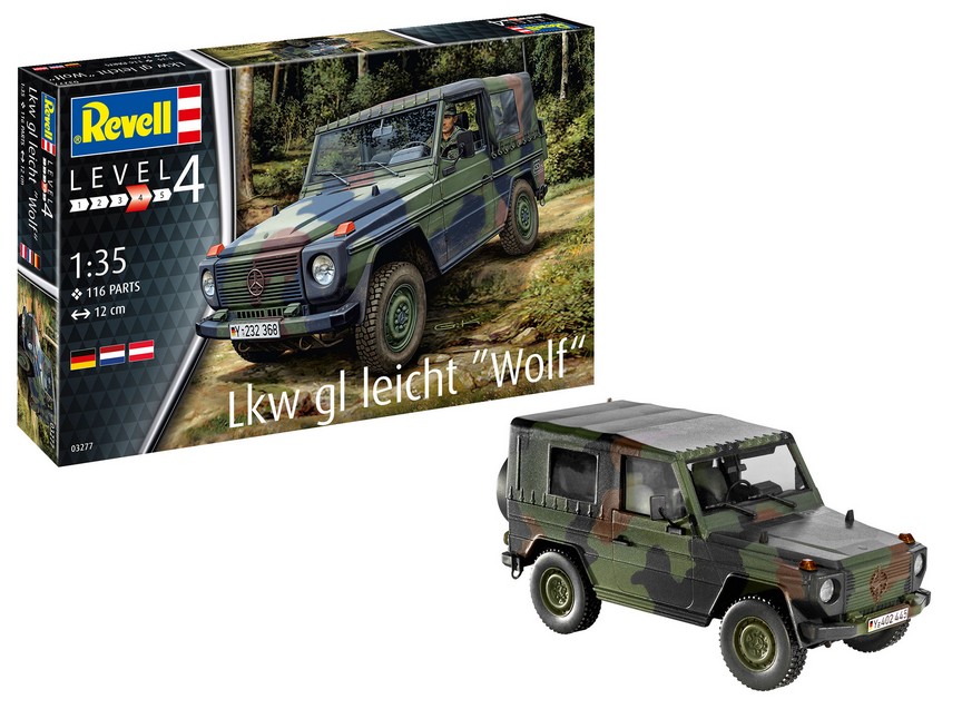 Modellbausatz des belieben Geländewagens Lkw gl leicht "Wolf", der in fast allen Teilen der Bundeswehr aufgrund seiner flexiblen Nutzungsmöglichkeiten eingesetzt wird.