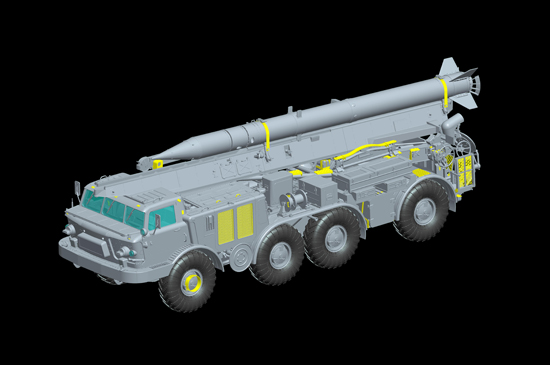 Plastikmodellbausatz eines sowjetischen Raketenträger-Systems aus den 1960er Jahren mit 900 Teilen, Photoätzteilen und Gummireifen. Länge gebaut 295 mm / Breite 85 mm.