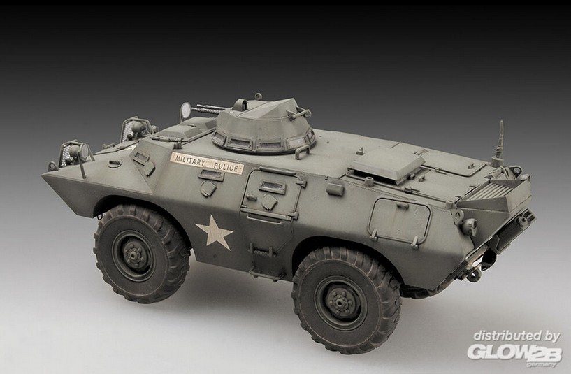 Plastikmodellbausatz eines US-amerikanischen Vierrad-Spähpanzers aus den 1960er Jahren mit 90 Teilen und Gummireifen. Länge gebaut 73 mm / Breite 30 mm.