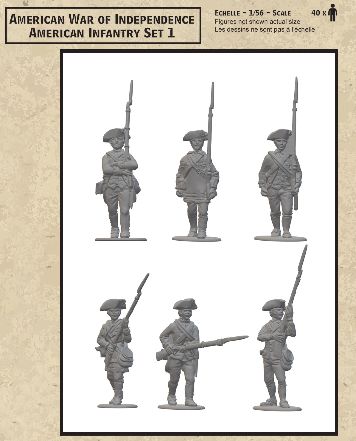 28 mm Amerikanische Infanterie Set 1. Amerikanischer Unabhängigkeitskrieg: Amerikanische Infanterie. Teile für 40 Figuren in verschiedenen Posen.