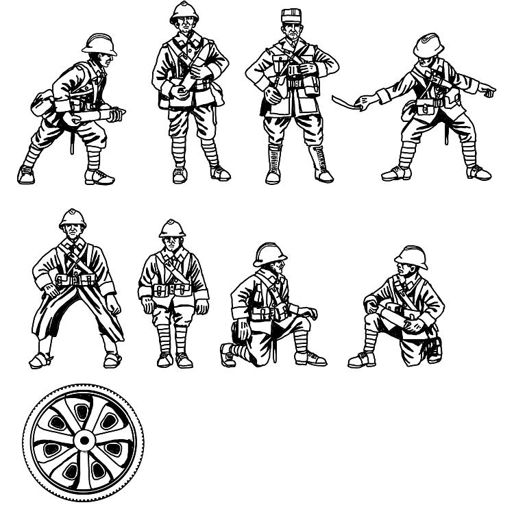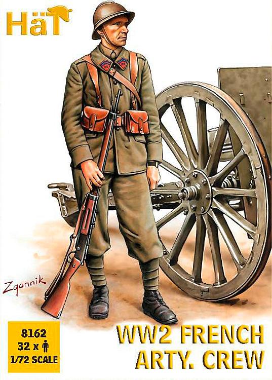 HÄT 8162: 2. Weltkrieg: französische Artillerie-Mannschaft, unbemalt. Inhalt für 32 Figuren in 8 verschiedenen Posen sowie zwei Wagenräder für Geschütze.