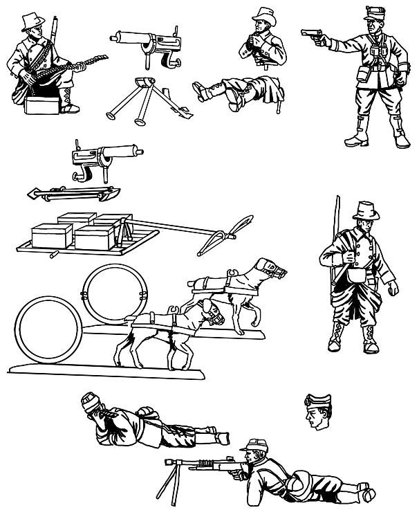 1. Weltkrieg: Plastikmodelle für Schwere belgische Waffen, unbemalt. Teile für 24 Figuren mit Pferden und Geschützen in unterschiedlichen Posen.