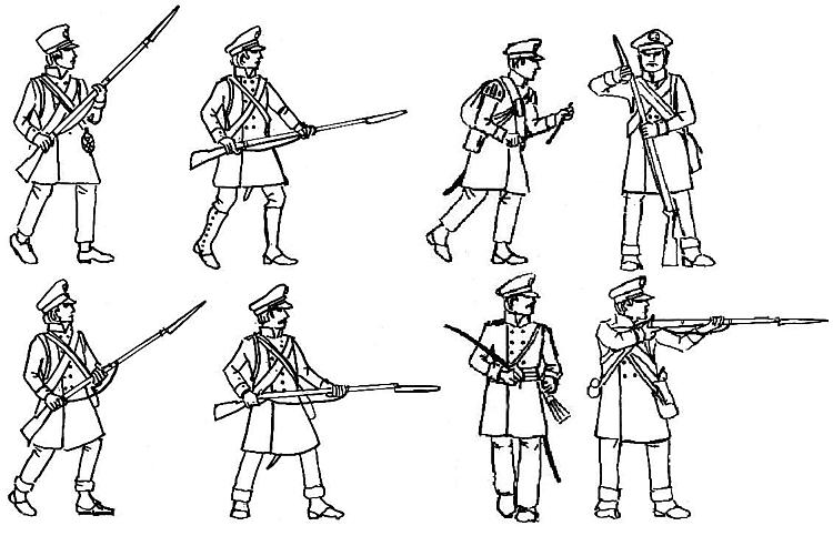 Plastikmodelle für preußische Landwehr, in Aktion, unbemalt. Teile für 56 Figuren in acht unterschiedlichen Posen.