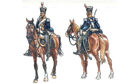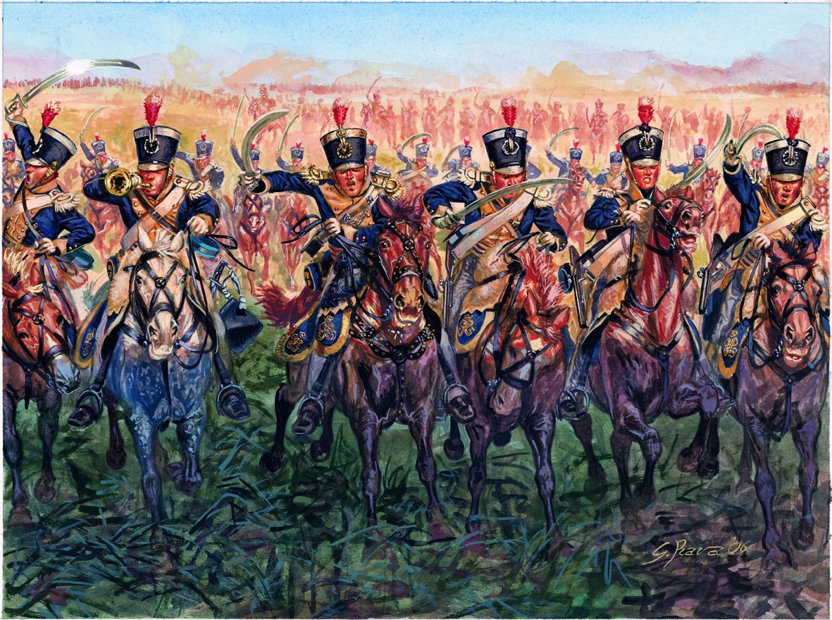 Light Dragoons and Hussars regiments , including a few units of the 'King's German Legion', part of the third brigade serving under major general Sir W.Dornberg , in June 1815 took part in the famous battle of Waterloo where Napoleon met his definitive defeat. Armed with sabers and Paget model carbines, or with the more common Baker cavalry rifle, they are here represented wearing their typical shako introduced in 1812.