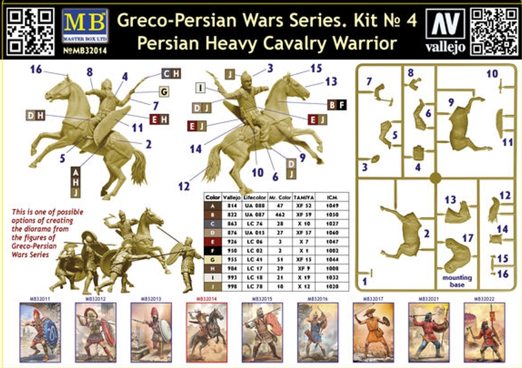 Der Bausatz 32014 setzt die Reihe der Bausätze fort, die den griechisch-persischen Kriegen des 5. Jahrhunderts v. Chr. gewidmet sind und stellt einen Bausatz mit Teilen für den Zusammenbau einer Figur eines schwer bewaffneten persischen Kavalleriekriegers dar. Solche schwer bewaffneten Kavalleriekrieger waren eine mächtige Stoßtruppe der persischen Armee und waren für eine Vielzahl von Zwecken bestimmt: Deckung der Flanken, Angriff auf die gegnerischen Schlachtformationen, um sie zu durchbrechen und zu besiegen, Spiegelung der gegnerischen Kavallerie usw.