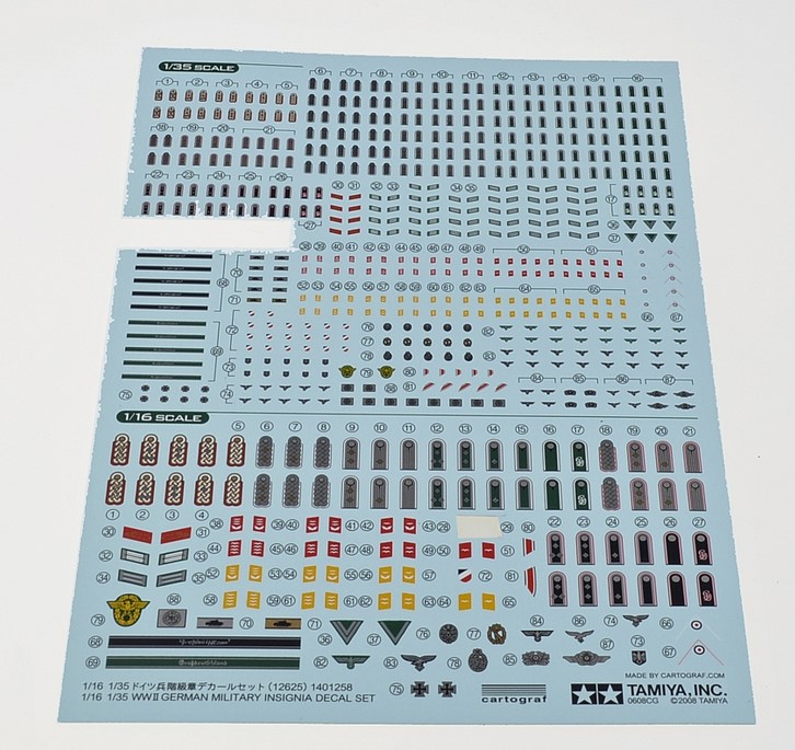 Detailgetreuer TAMIYA-Dekorbogen (Decal Set bzw. Abziehbilder) für deutsche Figuren des 2 Weltkrieges im Maßstab 1:16 sowie 1:35.