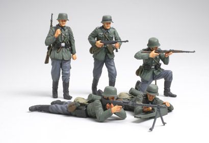 During WWII, the German combat uniform included a distinctively-shaped helmet which had a stretched neckline for added protection. The M36 combat uniform was an overall field gray color with a dark green collar, and featured four front pockets. The German soldiers also wore long black boots along with this basic uniform. At parades, the German soldiers would lift their legs high without bending their knees and perform the intensively impressive "Goose Step March."
