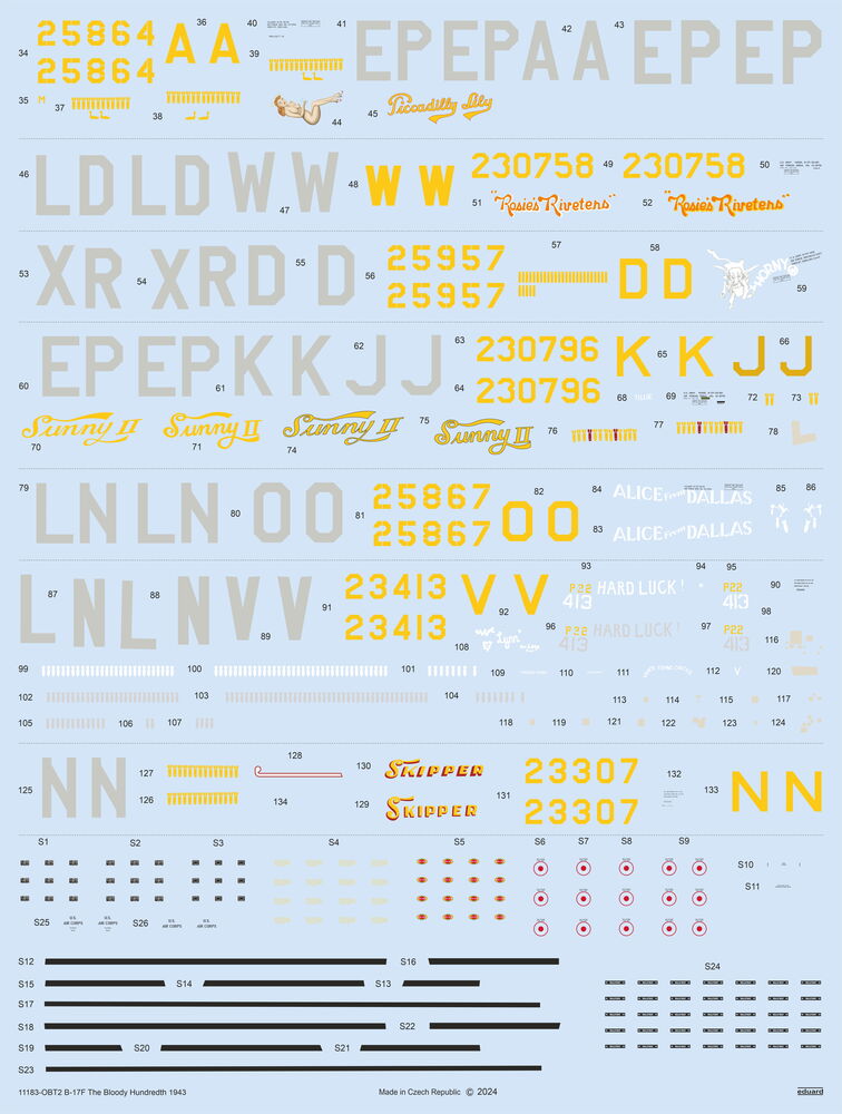 - Abziehbilderbogen mit 7 Markierungen von B-17Fs der 100th Bomb Group aus den Jahren 1943 bis 1944.