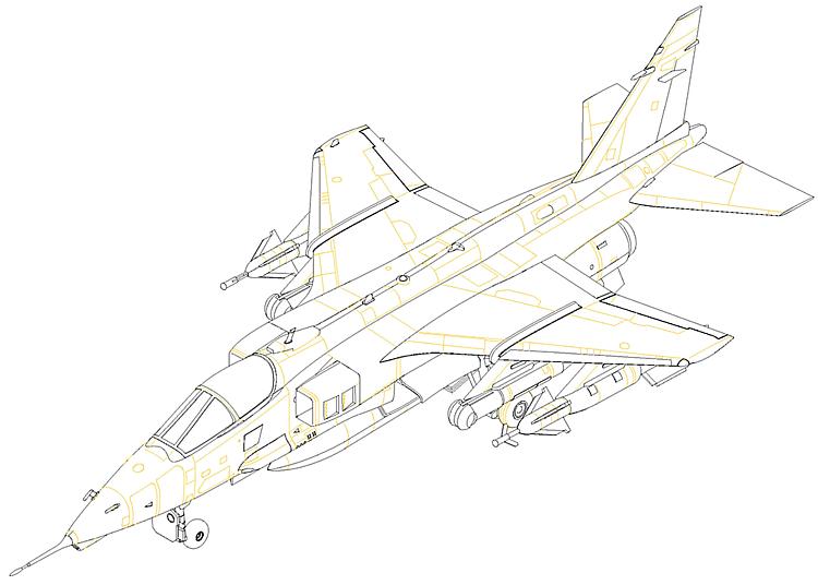 Plastikmodellbausatz eines britischen-französischen Angriffsflugzeugs aus den 1970er Jahren, hier in der Ausführung der französischen Luftwaffe. 110 Teile. Länge gebaut 229,4 mm / Flügelspannweite 122,4 mm.