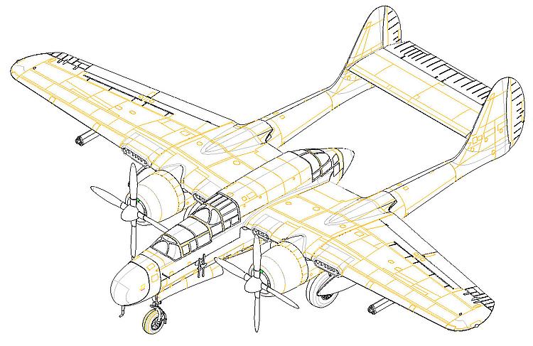 Plastikmodellbausatz eines US-Amerikanischen Nachtjägers aus den 1940er Jahren. 60 teile, Länge gebaut 210 mm / Flügelspannweite 279 mm.