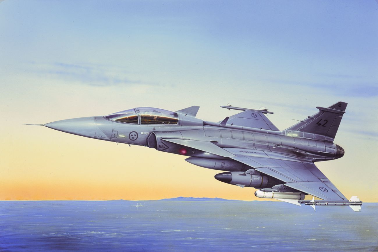 The Gripen is the standard fighter-bomber of the modern-day Swedish Air Force, where it came into service just a few years ago. Extremely manoeuvrable and compact, its sophisticated electronics provide it with all-weather, night-time flight capabilities. The aircraft can be fitted with an array of the latest air-air and air-surface weapons.
