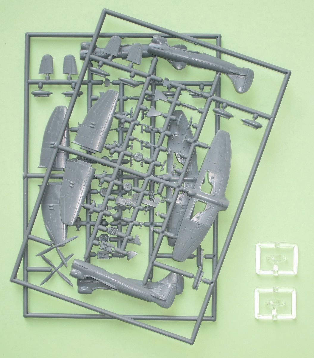 Two injection-moulded kits are supplied in this box and each kit contains 50 parts and one clear part (the cockpit canopy). A comprehensive decal sheet is included.
