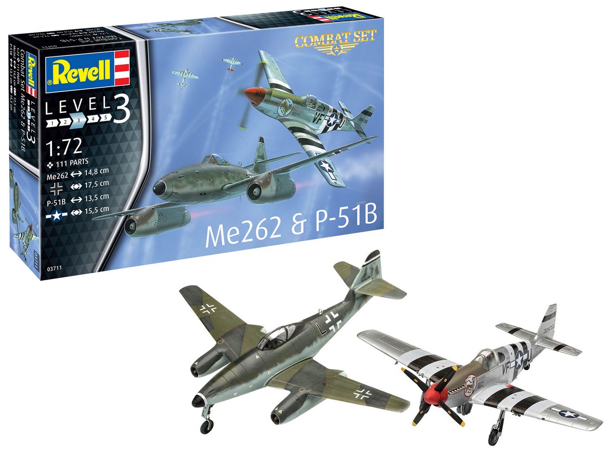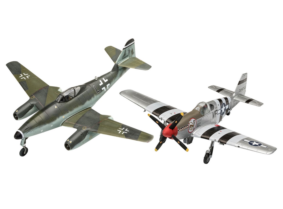 Modellbausatz-Set bestehend aus der amerikanischen P-51 Mustang und dem deutschen Strahljäger Me262.