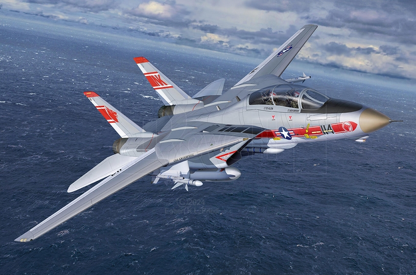 Modellbausatz der Grumman F-14A Tomcat, ein trägergestütztes Kampfflugzeug mit einem "Schwenkflügel"-Design. Maßstab 1:144. 49 Teile. 13,4 cm Länge. Geeignet ab 12 Jahren.