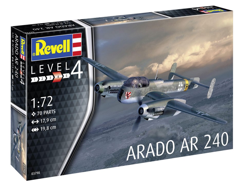 Modellbausatz des Zerstörers und Schnellbombers Arado Ar 240. Maßstab 1:72. 65 Teile. 186 mm Länge. Geeignet ab 12 Jahren.