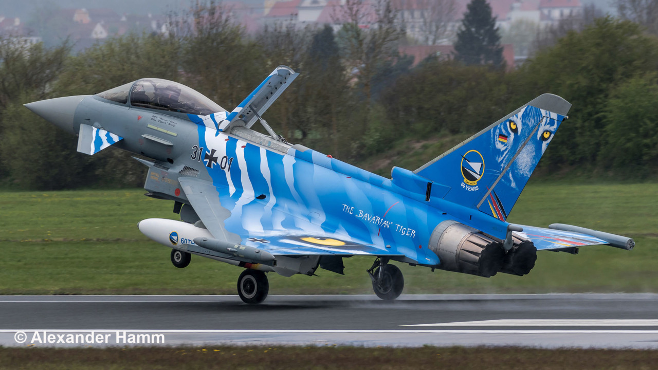 Der Eurofighter Typhoon "Bavarian Tiger 2021" ist ein zweimotoriges Mehrzweckkampfflugzeug mit einer beeindruckenden Geschwindigkeit von 2,25 Mach und einem maximalen Startgewicht von 55.000 Pfund. Entwickelt wurde es von der Eurpoean Fighter Aircraft (EFA). Die ersten Exemplare wurden 2003 an die Bundeswehr ausgeliefert. Bausatz des Eurofighter Typhoon mit dem unverwechselbaren Design als 'Bavarian Tiger 2021'.