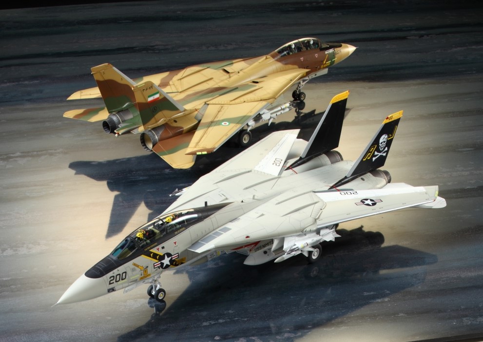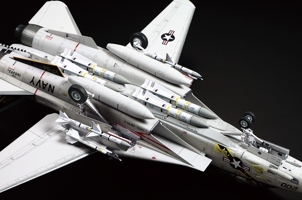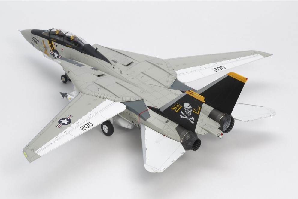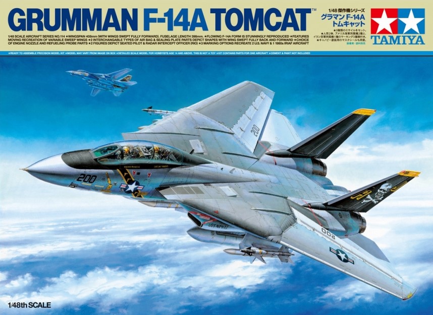 Die Grumman F-14A Tomcat der amerikanischen Marine genießt seit der Außerdienststellung 2006 immer noch großes Interesse in der Öffentlichkeit. Der Erstflug der F-14 war im Dezember 1970 und die Produktion startete 1974 und endete 1992. Angetrieben von zwei TF30 Triebwerken erreichte diese mit dem Nachbrennerschub eine Höchstgeschwindigkeit von ca. Mach 2,3. Die komplexe Bedienung erforderte einen zweiten Mann, den RIO (Radar Intercept Officer) im Cockpit, daher die Auslegung als Zweisitzer. Das vielleicht auffälligste Detail sind die Schwenkflügel, welche von 20° bis 75° geschwenkt werden können (20° für Start- und Landungen, 55° für den jeweiligen Einsatz, 68° Überschallflug, 75° Parkposition (Hangar/Flugzeugträgerdeck)). Die Schwenkflügel erlaubten situationsbedingte Geschwindigkeiten von Lande ? bis Höchstgeschwindigkeit. Die Aufnahme und der Einsatz der verschiedenen Waffensysteme machten die F-14 zu einen vielseitigen Trägersystem und erfolgreichen Abfangjäger.