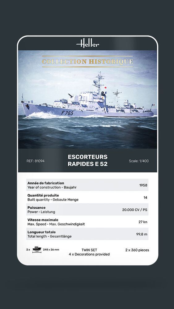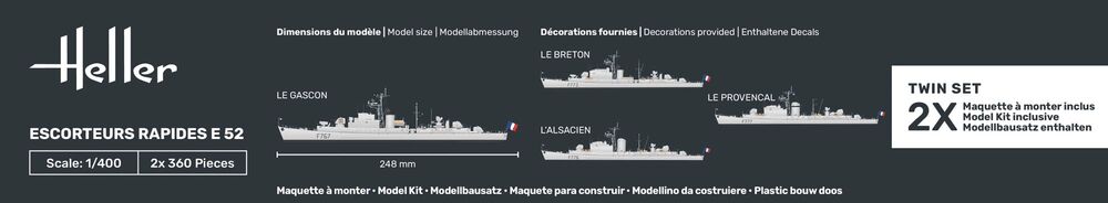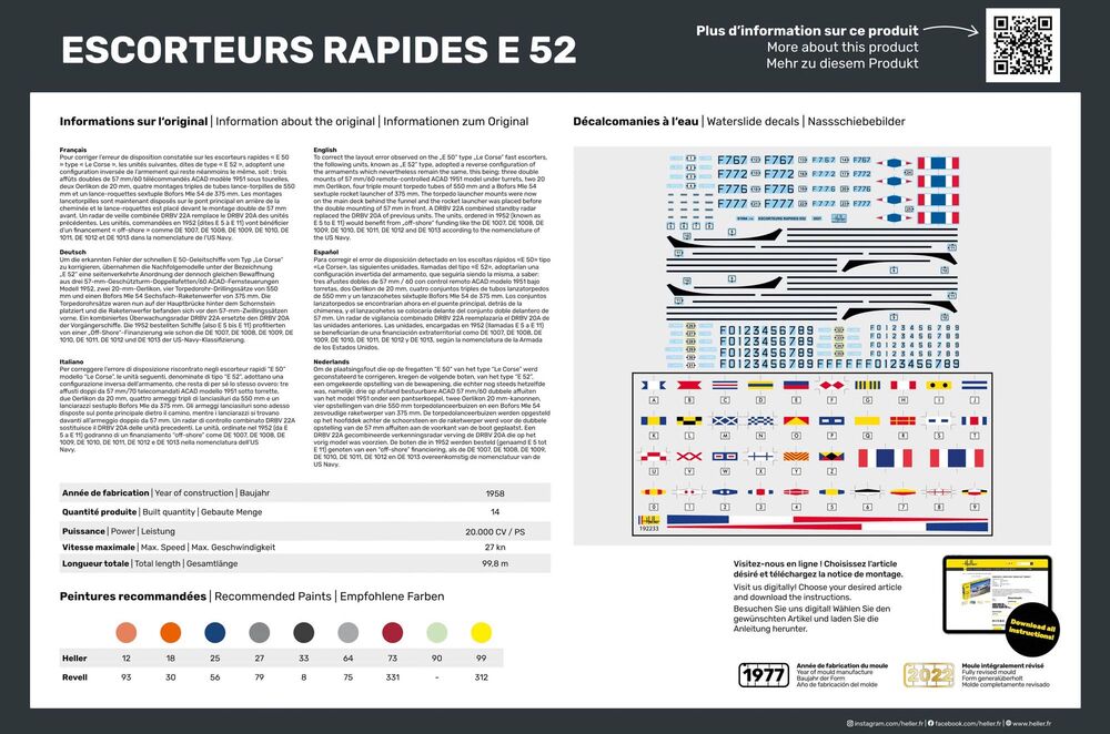Um die erkannten Fehler der schnellen E 50-Geleitschiffe vom Typ Le Corse zu korrigieren, übernahmen die Nachfolgemodelle unter der Bezeichnung E 52 eine seitenverkehrte Anordnung der dennoch gleichen Bewaffnung aus drei 57-mm-Geschützturm-Doppellafetten/60 ACAD-Fernsteuerungen Modell 1952, zwei 20-mm-Oerlikon, vier Torpedorohr-Drillingssätze von 550 mm und einen Bofors Mle 54 Sechsfach-Raketenwerfer von 375 mm. Die Torpedorohrsätze waren nun auf der Hauptbrücke hinter dem Schornstein platziert und die Raketenwerfer befanden sich vor den 57-mm-Zwillingssätzen vorne. Ein kombiniertes Überwachungsradar DRBV 22A ersetzte den DRBV 20A der Vorgängerschiffe. Die 1952 bestellten Schiffe (also E 5 bis E 11) profitierten von einer ?Off-Shore?-Finanzierung wie schon die DE 1007, DE 1008, DE 1009, DE 1010, DE 1011, DE 1012 und DE 1013 der US-Navy-Klassifizierung.