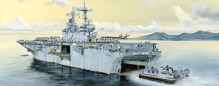 Plastikmodellbausatz eines modernen US-amerikanischen amphibischen Angriffsschiff der WASP-Klasse. Mit über 600 Teilen und Photoätzteilen. Ständer, Kleinschiffe, Flugzeuge und Helikopter liegen bei. Länge gebaut: 368,25 mm / Durchmesser: 89,5 mm.