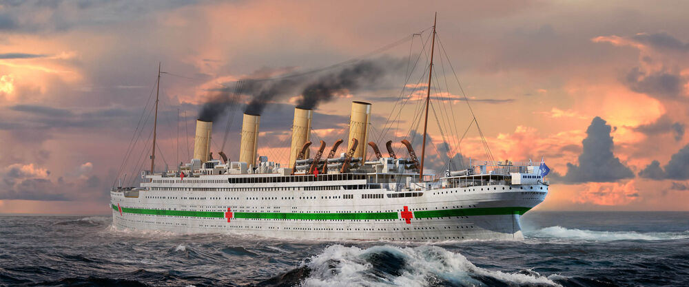 Plastikmodellbausatz eines britischen Ozean-Dampfers, Schwesterschiff der berühmten Titanic. Rund 570 Teile und Photo-Ätz-Teile. Länge gebaut 387,5 mm / Breite 41,2 mm.