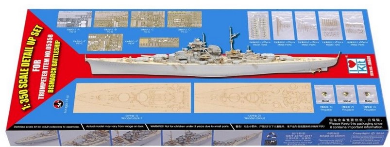 Aufrüstsatz für Bismarck 05358 im Maßstab 1/350. Beinhaltet verschiedene Metall-, Resin- und Kunststoffteile, etwa für Masten, Propeller, Netze, Antennen, Geländer, Holzdeck u.s.w.