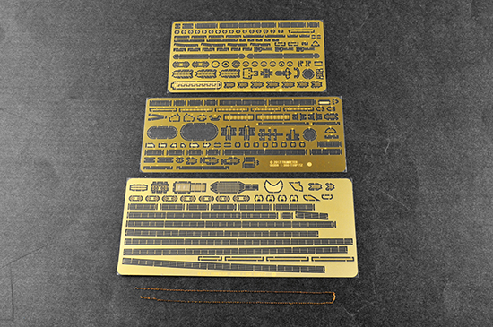 Plastikmodellbausatz eines deutschen WWII Schlachtschiffes mit 1180 Teilen, Metall- und Photoätzteilen sowie Ständer. Länge gebaut: 715,7 mm. Durchmesser: 105,9 mm.