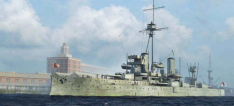 Plastikmodellbausatz eines britischen Schlachtschiffes aus den 1900er Jahren, hier im Bauzustand 1918. 270 Teile, Photoätzteile und Ständer. Länge gebaut 230,9 mm / Durchmesser 36,2 mm.