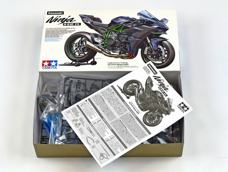 This 1/12 scale assembly model kit recreates Kawasaki's hyper-powerful Ninja H2R bike, a track-only monster that the famed Japanese manufacturer announced in 2015. The Ninja H2R was developed with input from many of the companies in the larger Kawasaki Heavy Industry group, and its name is a composite of two legendary Kawasaki bikes: the famed Ninja and the H2R. The Ninja H2R not only looks the part with a combination of bare carbon fiber and exquisite mirrored finish black chrome parts, it also has mind-blowing specs. It generates a hair-raising 300hp-plus from its supercharged 998cc inline-4, which it translates into other-worldly acceleration. It is also chock-full of up-to-date electronics for the track: traction control, engine brake control and more.