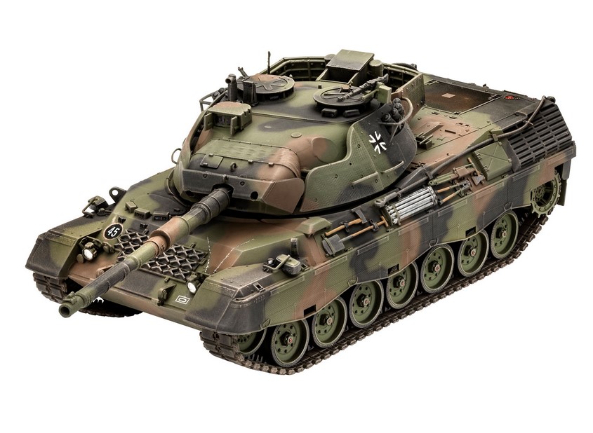 Modellbausatz des deutschen Leopard 1A5. Zwischen 1986 und 1992 erhielt der Leopard 1 eine Kampfwertsteigerung, die unter anderem eine verbesserte Feuerleitanlage beinhaltete. Entsprechend umgerüstete Fahrzeuge wurden als Leopard 1A5 bezeichnet.