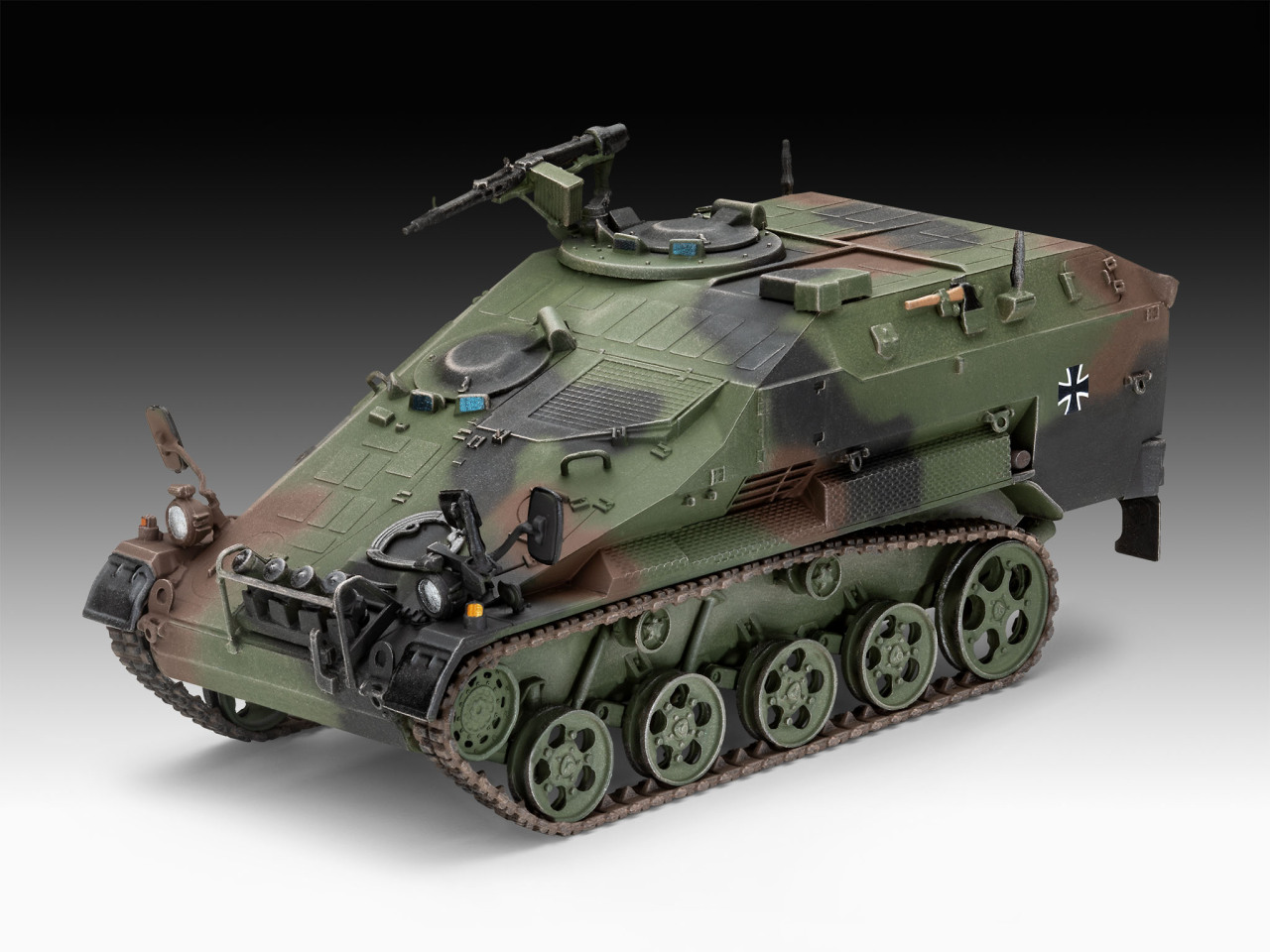 Modellbausatz des Wiesel 2 Ozelot, ein auf Basis des Waffenträgers Wiesel 2 entwickeltes leicht gepanzertes Kurzstrecken-Flugabwehrraketensystem der Bundeswehr. Eingeführt wurde es bei der Heeresflugabwehrtruppe.