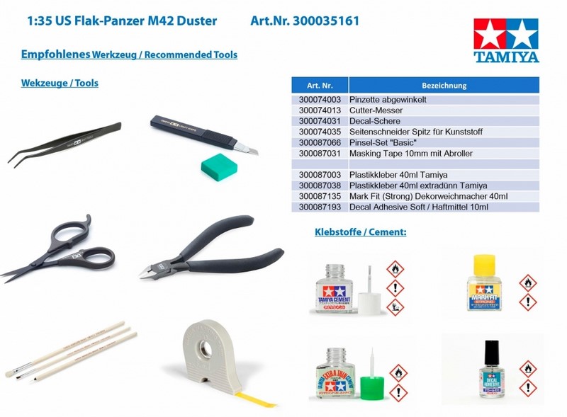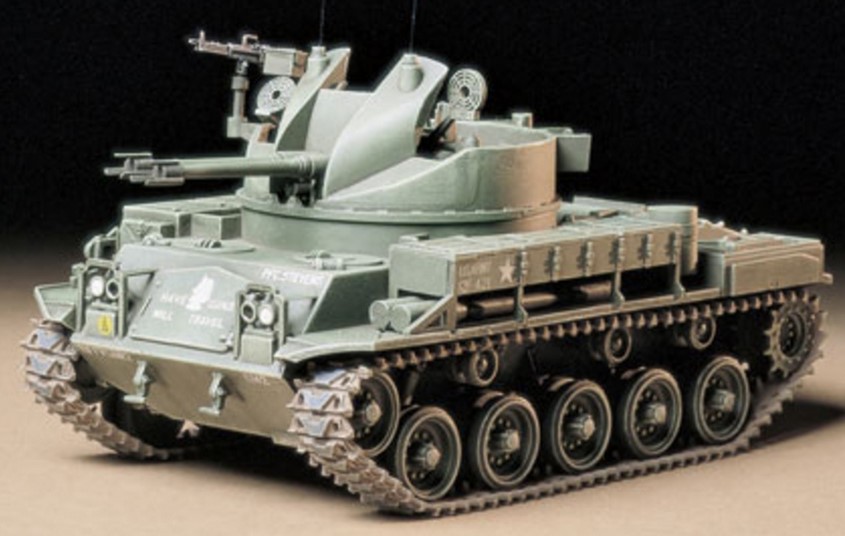 Das Standmodell ist eine Nachempfindung des US Flak-Panzer M42 Duster. Hierbei handelt es sich um ein Flugabwehrfahrzeug, welches in Verbindung mit Panzereinheiten eingesetzt wurde und mit ein paar 40-mm-Kanonen ausgestattet war. Die In-Dienststellung des Fahrzeugs fand 1953 bei der US-Armee statt. Das Fahrzeug wird von einem 500-PS-Motor bis auf eine Höchstgeschwindigkeit von 70 Km/h befördert. Die TAMIYA Modellbaukastenversion besticht durch die hohe Passgenauigkeit als auch durch die Detailtreue.