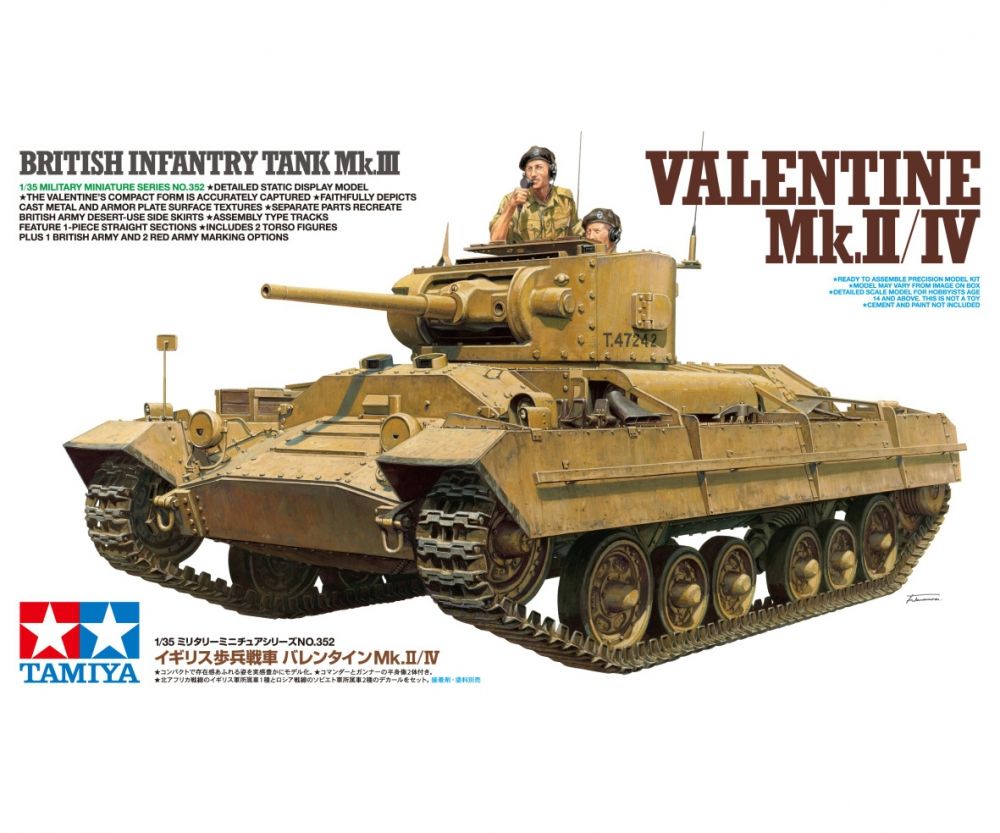 This is an all new tooled model of the British Valentine Infantry tank in 1/35 scale. British armor doctrine in the 1930s up to the outbreak of WWII called for 2 types of tank - more mobile cruiser tanks and heavy, slow infantry tanks. The Valentine was a prolifically produced example of the latter (7,315 units, more than 30% of British tank production in WWII). It was based upon existing cruiser tank designs and relatively easy to manufacture, a critical point for the British military after it had lost so much material during the Dunkirk evacuation in 1940. The Valentine would see extensive action in North Africa, particularly the Mk.II and Mk.IV variants (they had different engines) depicted by this kit. Over 4,500 were also handed over to the Soviet Union under the lend-lease agreement, the Red Army using them mainly for recon work.