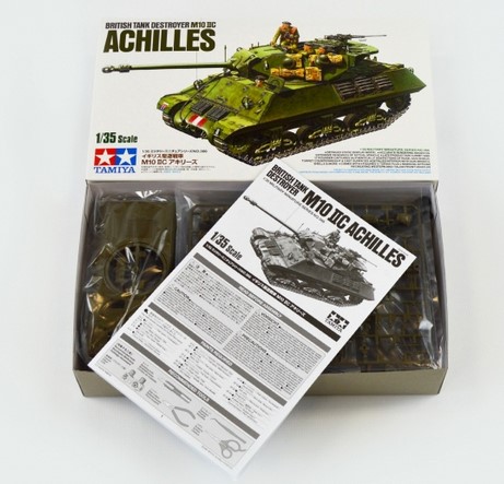 Here is the British Achilles tank destroyer, which appears in Tamiya 1/35 scale for the first time! The Achilles was a modification of the M10s which Britain received from the U.S., with the original 3-inch main gun replaced by the fearsome British 17 pounder. The vast majority of M10s were the M10 IIC variant, which was based upon the late-production M10 with distinctive enlarged turret-rear counterweight. Around 1,000 were produced between Spring 1944 and the end of WWII, the Allied forces making good use of it after the Normandy landings, benefiting from the power of the gun which allowed it to tear through Tiger I front armor.
