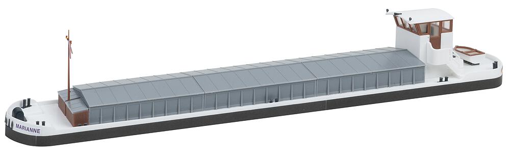 Ein weißes Modellschiff bringt die Welt der Binnenschifffahrt auf die Anlage. Mit seinem schmucken Steuerhaus, dem abgeflachten Rumpf und dem großzügigen Stauraum im zentralen Container ist es bereit, die Miniaturfracht an Bord zu nehmen. Das Modell ist als Wasserlinienversion gestaltet und nicht schwimmfähig.
