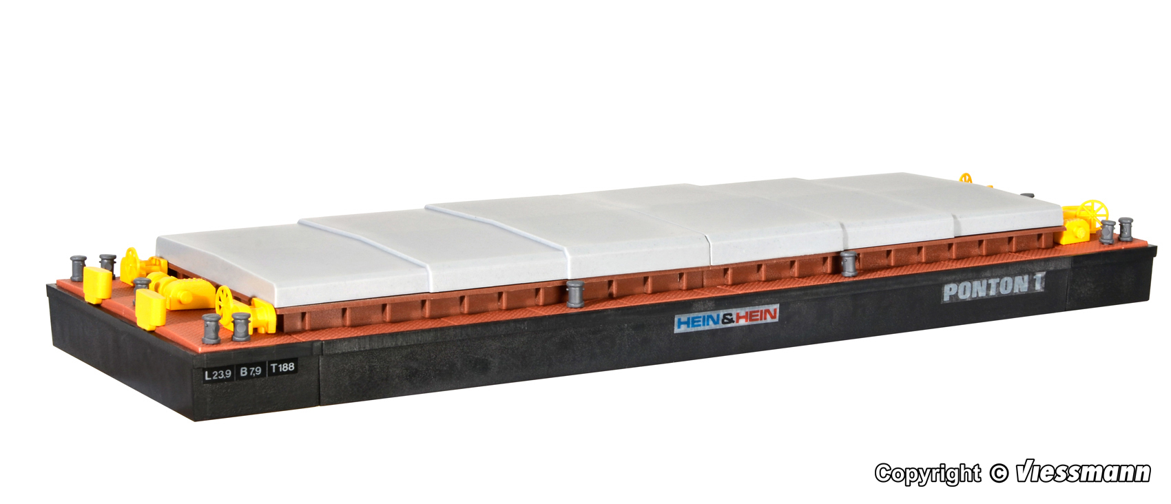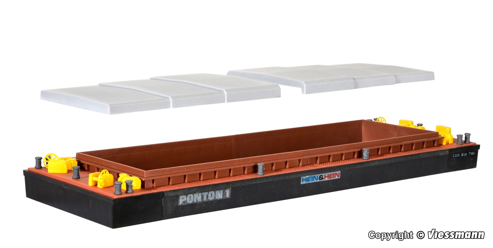 Bausatz. Schubleichter sind unbemannte offene Wasserfahrzeuge, die genormte Größen aufweisen. In der Binnenschiffahrt werden in der Regel zwei oder vier Leichter zu einem starren Schiffsverband zusammengekoppelt. Ihre Anzahl ist abhängig von der Wasserbreite eines Flußlaufes oder Kanals. Einen solchen Schubleichter, der überall auf europäischen Wasserstraßen anzutreffen ist, hat kibri originalgetreu nachempfunden und ein Modell entwickelt, bei dem die kastenförmige Form mit nur geringen Tiefgang gut zum Ausdruck kommt. Mit den auch im Modell beweglichen Rolluken läßt sich die Schiffsladung aus Erz, Sand oder Getreide abdecken. Maße: 27,5 x 9 x 2,8 cm