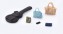 - moderne Zuebhörteile, wie Kaffeebecher, Smartphone, Gitarre und verschiedene Taschen