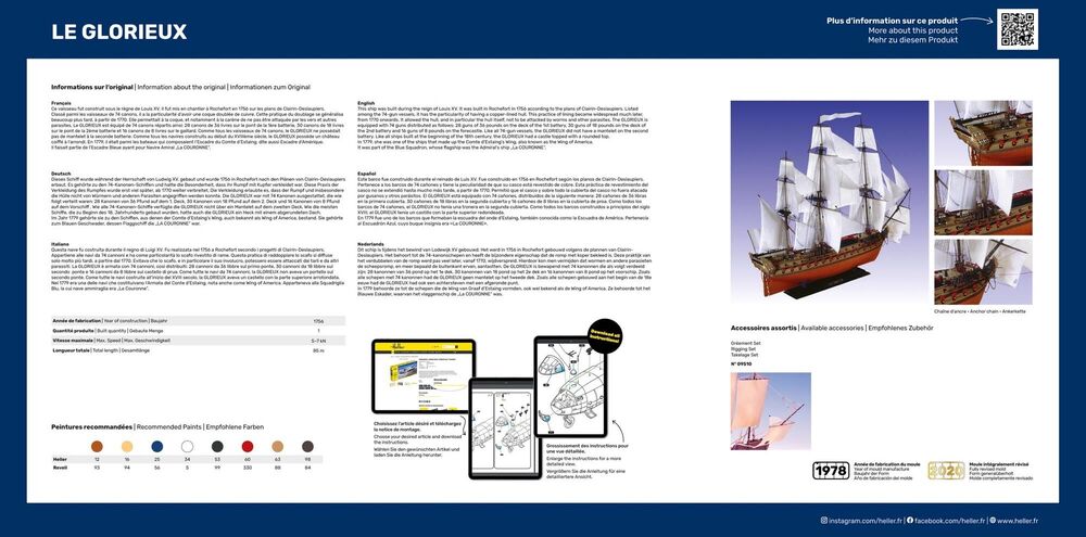 Dieses Schiff wurde während der Herrschaft von Ludwig XV. gebaut. Es wurde 1756 in Rochefort nach den Plänen von Clairin-Deslaupiers erbaut. Es gehört zu den 74-Kanonen-Schiffen und hat die Besonderheit, dass ihr Rumpf mit Kupfer ausgekleidet ist. Diese Praxis der Verdopplung des Rumpfes wurde erst viel später, ab 1770, weit verbreitet. Sie erlaubte es, dass der Rumpf und insbesondere die Hülle des Rumpfes nicht von Würmern und anderen Parasiten angegriffen werden konnte. Die GLORIEUX ist mit 74 Kanonen ausgestattet, die wie folgt verteilt sind: 28 Kanonen von 36 Pfund auf dem 1. Deck, 30 Kanonen von 18 Pfund auf dem 2. Deck und 16 Kanonen von 8 Pfund auf dem Vorschiff. Wie alle 74-Kanonen-Schiffe verfügte die GLORIEUX nicht über ein Mantelet auf dem zweiten Deck. Wie alle Schiffe, die zu Beginn des 18. Jahrhunderts gebaut wurden, hatte auch die GLORIEUX ein Schloss mit einer abgerundeten Spitze. Im Jahr 1779 gehörte sie zu den Schiffen, aus denen der Comte d'Estaing's Wing, auch bekannt als Wing of America, bestand. Sie gehörte zum Blauen Geschwader, dessen Flaggschiff die 'La COURONNE' war.