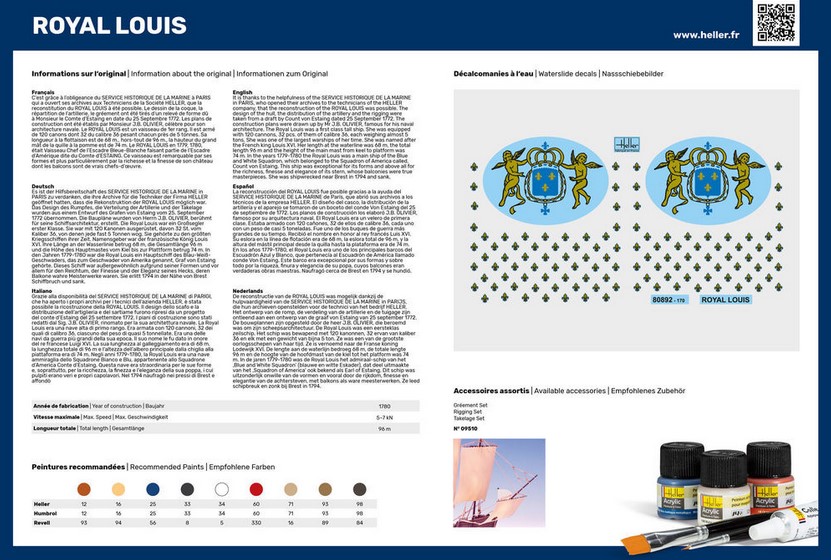 Es ist der Hilfsbereitschaft des SERVICE HISTORIQUE DE LA MARINE in PARIS zu verdanken, die ihre Archive für die Techniker der Firma HELLER geöffnet hatten, dass die Rekonstruktion der ROYAL LOUIS möglich war. Das Design des Rumpfes, die Verteilung der Artillerie und der Takelage wurden aus einem Entwurf des Grafen von Estaing vom 25. September 1772 übernommen. Die Baupläne wurden von Herrn J.B. OLIVIER, berühmt für seine Schiffsarchitektur, erstellt. Die Royal Louis war ein Großsegler erster Klasse. Sie war mit 120 Kanonen ausgerüstet, davon 32 St. vom Kaliber 36, von denen jede fast 5 Tonnen wog. Sie gehörte zu den größten Kriegsschiffen ihrer Zeit. Namensgeber war der französische König Louis XVI. Ihre Länge an der Wasserlinie betrug 68 m, die Gesamtlänge 96 m und die Höhe des Hauptmastes vom Kiel bis zur Plattform betrug 74 m. In den Jahren 1779-1780 war die Royal Louis ein Hauptschiff des Blau-Weiß-Geschwaders, das zum Geschwader von Amerika genannt, Graf von Estaing gehörte. Dieses Schiff war außergewöhnlich aufgrund seiner Formen und vor allem für den Reichtum, der Finesse und der Eleganz seines Hecks, deren Balkone wahre Meisterwerke waren. Sie erlitt 1794 in der Nähe von Brest Schiffbruch und sank.