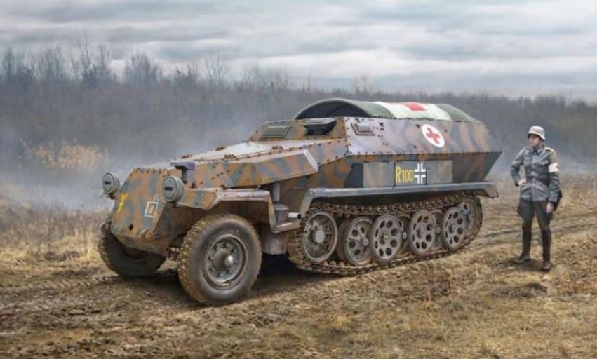 Der Schützenpanzerwagen Sd.Kfz. 251 war ein gepanzertes Halbkettenfahrzeug, das während des Zweiten Weltkriegs von der Wehrmacht eingesetzt wurde. Angetrieben von einem Maybach 6-Zylinder-Benziner erreichte das Sonderkraftfahrzeug 251 auch im Gelände eine Geschwindigkeit von bis zu 55 km/h. Der Schützenpanzerwagen wurde in großen Stückzahlen hergestellt und hauptsächlich für den Transport von Panzergrenadieren verwendet. Während des Krieges wurden jedoch mehrere Versionen entwickelt, um den unterschiedlichen militärischen Anforderungen gerecht zu werden. Der ?Krankenpanzerwagen? 251/8 wurde in der Nähe der Front eingesetzt. Er konnte bis zu acht sitzende Opfer oder vier sitzende Opfer und zwei Krankentragen sowie die notwendige medizinische Ausrüstung transportieren.
