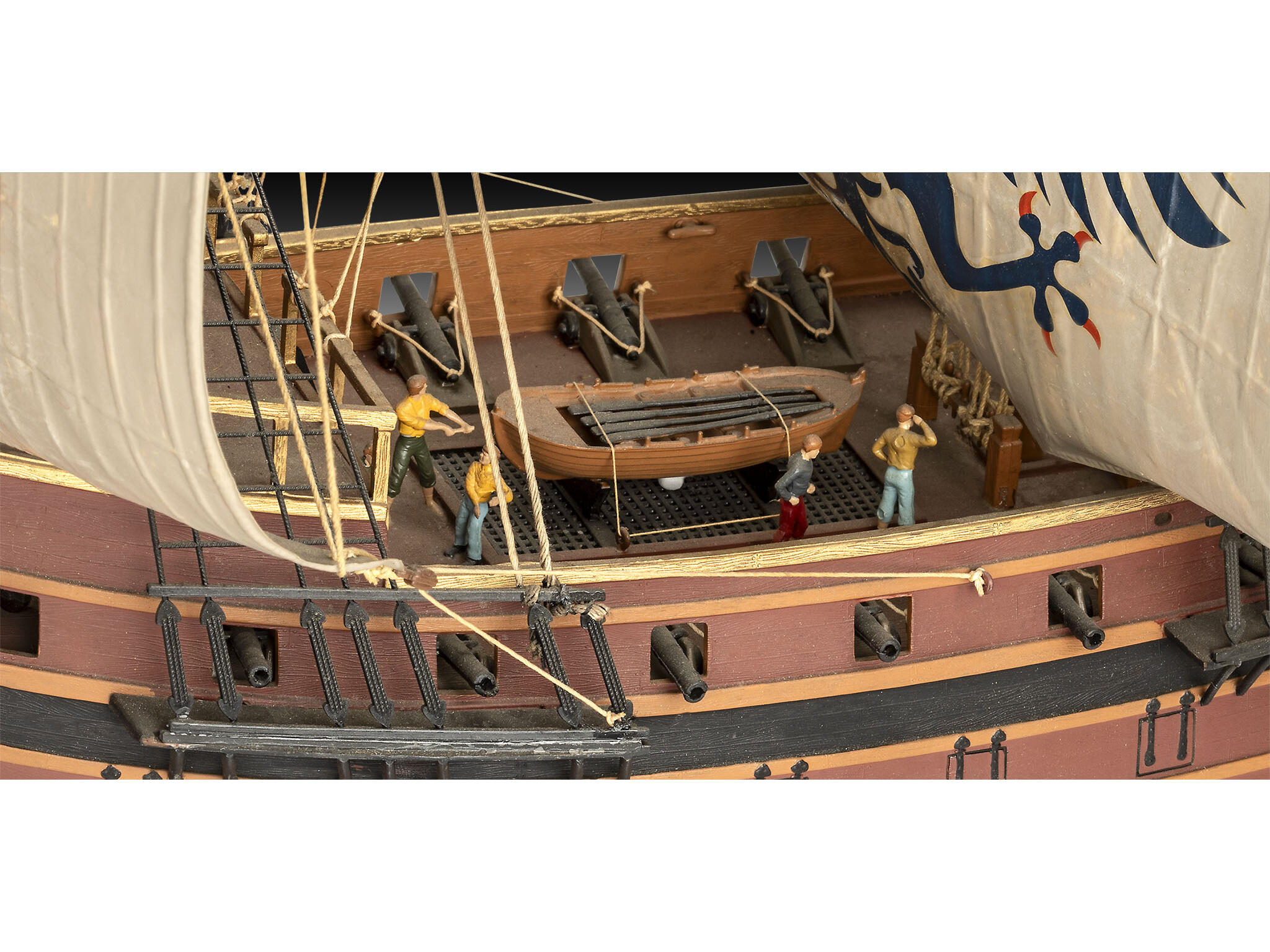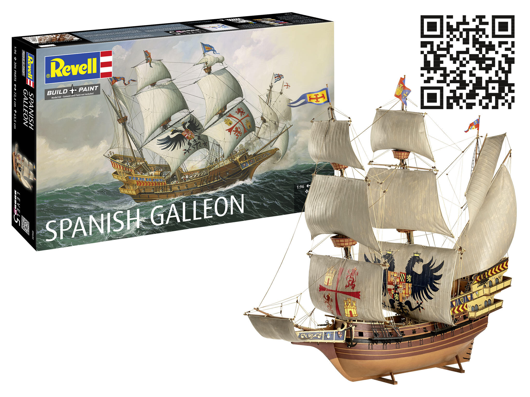 Geschichtlich gesehen war die spanische Galeone einer der berühmtesten Schiffstypen während des goldenen Alters der Segelschiffe. Die ersten Galeonen traten um die Mitte des sechzehnten Jahrhunderts in Erscheinung, und für fast hundert Jahre dienten diese beliebten Segelschiffe als Kriegs- sowie auch als Handelsschiffe. Die Galeone ist ein direkter Nachkomme der durch Ruder betriebenen Galeeren, die Rümpfe waren schlanker als die massigen, schwerfälligen Naos, und dennoch fassten ihre Laderäume große Warenmengen. Spanische Galeonen befuhren die Weltmeere und transportierten Juwelen, Gold, feine Stoffe und andere wertvolle Ware. Um Angriffe von Seeräubern abzuwehren, hatten die spanischen Schiffe ihren eigenen Schutz in Form von schweren Messingkanonen. Die berühmte spanische Armada von 1588 war aus über 70 bewaffneten Galeonen zusammengestellt. In einer der größten Seeschlachten der Geschichte, forderte die mächtige spanische Flotte die kleine Seemacht von Englands Königin Elizabeth heraus. König Philip II von Spanien plante seine mächtige Armada dazu zu benutzen, seine Armee über den Ärmelkanal zu transportieren, und die britische Insel zu erobern. In der Zwischenzeit hatten aber auch die Engländer mit einer kleineren Flotte ihre Verteidigung organisiert. Mehr als einen Monat verfolgte die englische Flotte die Armada. Am 28. Juli 1588 gingen die Spanier in Gravelines vor Anker. Mit dem Nachtwind und der Flut segelten acht brennende englische Schiffe mitten mitten zwischen die spanische Flotte. In ihrer Eile, den Feuerschiffen zu entkommen, hatten die Spanier ihre Anker losgeschnitten und trieben teilweise gegen die Felsen nahe der Küste. Die disziplinierte spanische Formation brach auseinander, die Reste der aufgelösten Armada segelten nun nordwärts, um Schottland und Irland herum.