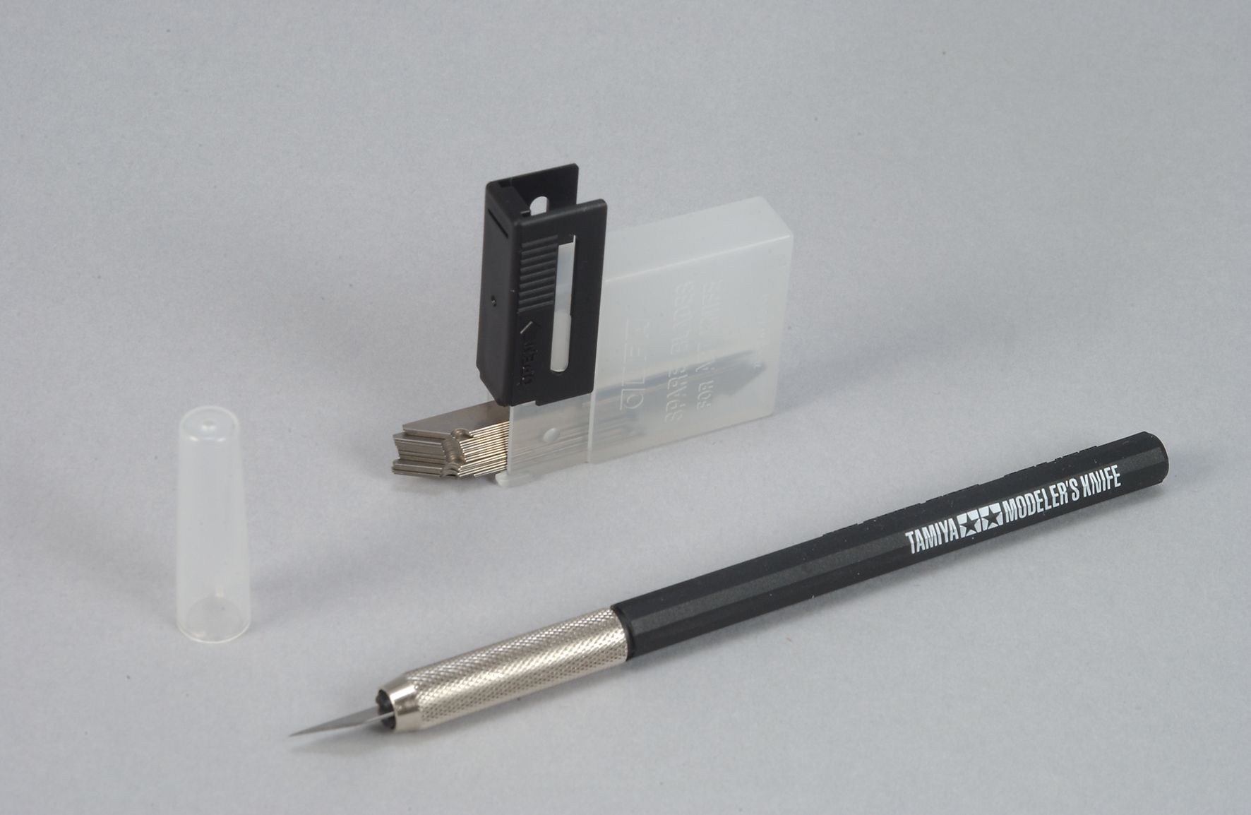 Das Bastelmesser ist eines der wichtigsten Werkzeuge im Modellbau. Die scharfen und feinen Klingen ermöglichen das Austrennen feinster Kunststoffteile aus den Gießästen sowie den Zuschnitt von Kunststoffplatten, -profilen und Dekoren/Aufklebern. Sollten nach dem Zusammenbau Kunststoff- oder Kleberreste überstehen, können diese mit der feinen und widerstandsfähigen Klinge abgeschabt werden. Wenn eine Klinge abgenutzt wurde, so ist eine verletzungsfreie Entsorgung im beigefügten Behälter möglich.