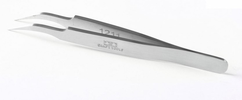 These precision made stainless steel tweezers are ideal for handling small, delicate plastic model parts. An angled type which can access hard to reach areas and a straight type which directly transmits finger movements to the tip for optimum control are available.