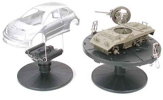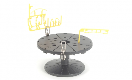 Ein Mehrzweck-Lackierständer mit zwei verschiedenen Aufsätzen. Der Aufsatz mit dem breiten Clip eignet sich hervorragend für die Aufnahme von größeren Teilen wie z.B. einer Karosserie im Maßstab 1:24. Hierbei ist die Karosserie "frei schwebend" befestigt und umdrehbar (360°) und kann problemlos von allen Seiten lackiert (z.B. Sprühdose oder Airbrush) werden. Der Lackierteller mit seinen 16 cm im Durchmesser (drehbar 360°) bietet viel Platz für die Lackierung oder Trocknung von Kleinteilen und Spritzästen. Sollte die Fläche nicht ausreichen, können weitere Teile an den Krokoklemmen (4 Stück im Lieferumfang enthalten) am Tellerrand befestigt werden. Es sind weitere Bohrungen für die Aufnahme von Lackierstäben auf dem Drehteller vorhanden.