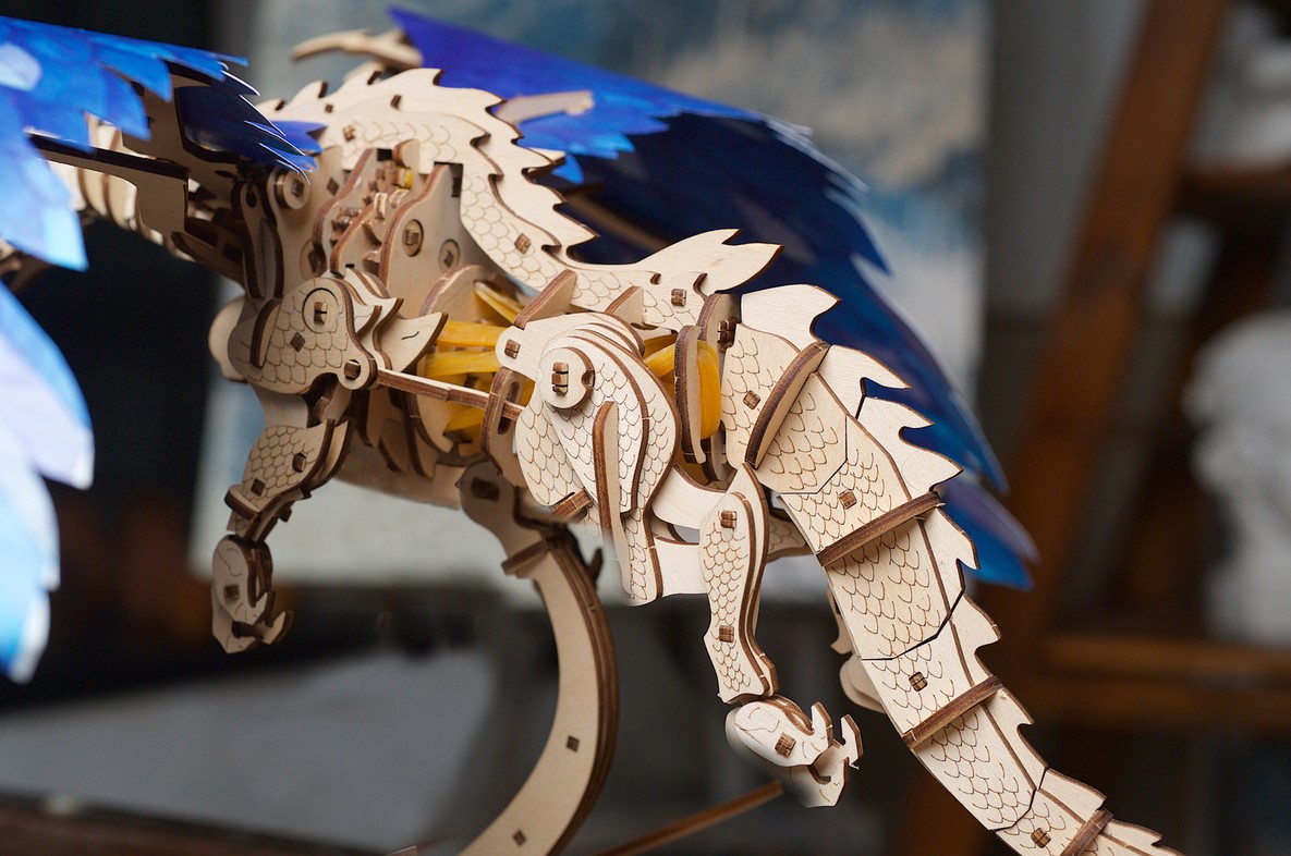 Das DIY-Holzpuzzle Sturmdrache ist ein klassisches sagenhaftes Reptil. Dank seines offenen Designs dieses 3D-Puzzles können Sie das Herz - den Gummimotor - Ihres wunderbaren neuen Haustiers schlagen sehen. Vorne an seiner Brust befindet sich ein Schlüssel zum Aufziehen. Halten Sie zum Aufziehen den Körper des Drachen fest und drehen Sie den Schlüssel im Uhrzeigersinn. Lösen Sie den Motor, indem Sie den Starthebel ziehen. Und dann beginnt der Zauber: die Arme, die Beine, sogar der Körper des Holz-Drachen beginnen sich zu bewegen. Selbstverständlich setzen sich auch die beiden kräftigen und herrlichen Flügel in Bewegung. Das ist das ganz besondere Merkmal Ihres Ugears-Drachen: Die Knochen der Flügel sind aus Holz, aber der Rest besteht aus Papier in herrlichem Feder-Design. Das weichere und flexible Material verleiht dem Flug ein ausgesprochen realistisches Aussehen und lässt Raum für Ihre eigenen Ideen.
