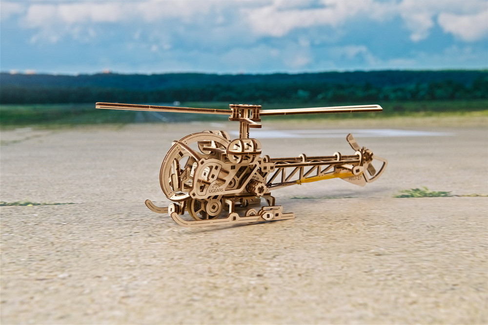 Der Mini-Hubschrauber von Ugears ist das erste Hubschraubermodell in unserer Smart-Sammlung und bildet zusammen mit den Modellen Mini-Doppeldecker, Verrückte Hornisse, Steampunk-Luftschiff und Flieger (mit den austauschbaren Komponenten Flugzeug und Hubschrauber) die Familie der fabelhaften Ugears-Luftfahrzeuge. Das offene Design lässt wirklich alle Aspekte dieses DIY Hubschraubermodells erkennen. Dieses 3D-Puzzle eines Helikopters weist viele realistische Details auf. Dazu gehören ein sich drehender Rotormast und der Hauptrotor, der sich drehende Heckrotor, das zweisitzige Cockpit mit zyklischen Steuerknüppeln, Türen, die geöffnet werden können, ein verstellbarer Suchscheinwerfer an der Vorderseite, einfahrbare Hinterräder, Landekufen und ein Vertipad, auf das Sie Ihr Modell stellen können.