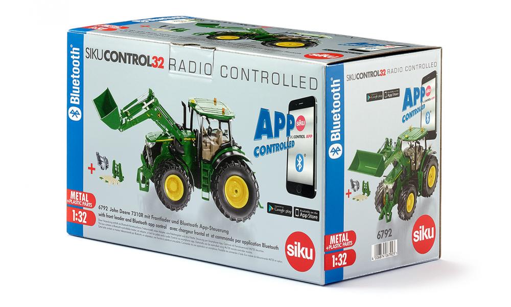Die kostenlose App herunterladen, Bluetooth-Verbindung aktivieren und los geht der Spielspaß. Mit der neuen SIKUCONTROL APP kann der John Deere 7310R mit Frontlader mit dem Smartphone und dem Tablet (Android- und iOS-Technologie) gesteuert werden. Alternativ wird der Traktor auch im Set mit dem Fernsteuermodul Bluetooth angeboten. Der John Deere 7310R ist der stärkste Vertreter in der Baureihe 7R. Das SIKUCONTROL-Modell aus Metall und Kunststoff zeichnet sich nicht nur durch die zahlreichen Features aus, sondern auch durch die bei Fans so geschätzte Detailliebe. Alle Funktionen und die fünf Getriebe des Traktors lassen sich über die kostenlose App steuern. Wahlweise über die virtuelle Gamepad-Steuerung oder die Bewegungssensoren der mobilen Geräte. Dieses intuitive Feature ist eine willkommene Abwechslung und bietet zusätzlichen Spielspaß. Mit der App ist präzises Rangieren genauso möglich wie das Steuern der Frontlader, der Anhänger von Joskin und Fortuna oder dem Pflug von Vogel & Noot. Wie beim Fernsteuermodul lassen sich zudem das Fahrlicht an der Motorhaube, die Arbeitsscheinwerfer an der Kabine, die Heckblinker und die Rundumleuchten schalten. Die SIKUCONTROL APP bietet Traktorfans zusätzlich wissenswerte Informationen über den John Deere 7310R. Für den Traktor kann zudem ein Name angelegt werden. Die Einstellung und Funktionen der App werden laufend aktualisiert. Mit der OTA(Over-The-Air)-Funktion der App kann die Software im Traktor direkt upgedated werden.