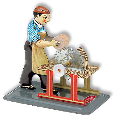 Arbeiter mit drehendem Werkstück an der Kreissäge. Aus lackiertem und bedrucktem Blech.