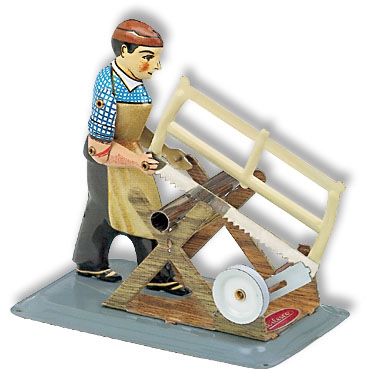Arbeiter mit einer Spannsäge am Sägebock. Aus lackiertem und bedrucktem Blech.